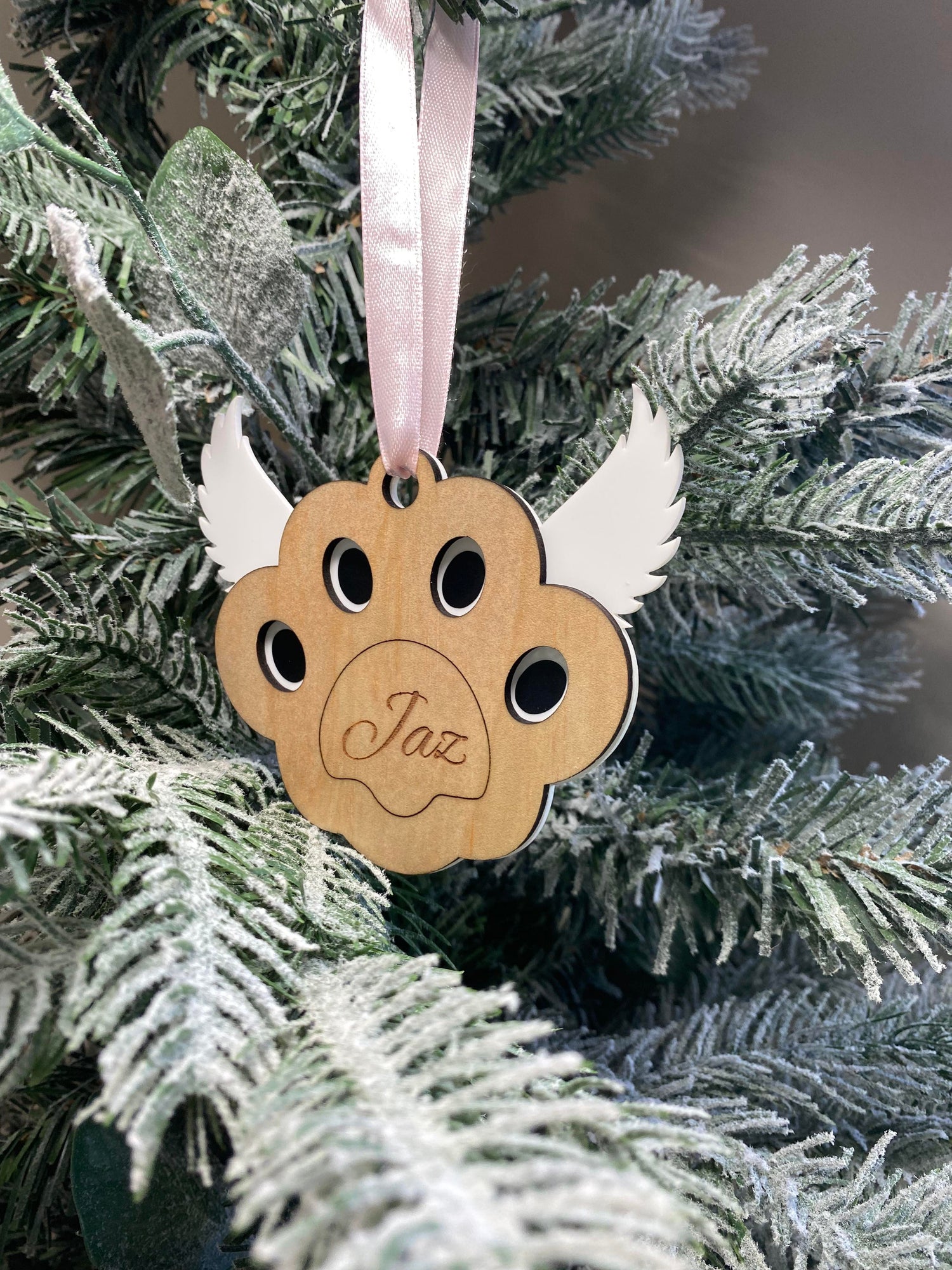 This angel wing cat paw has beautiful white acrylic angel wings, and black vinyl paw pads. custom made to order and personalised to suit.