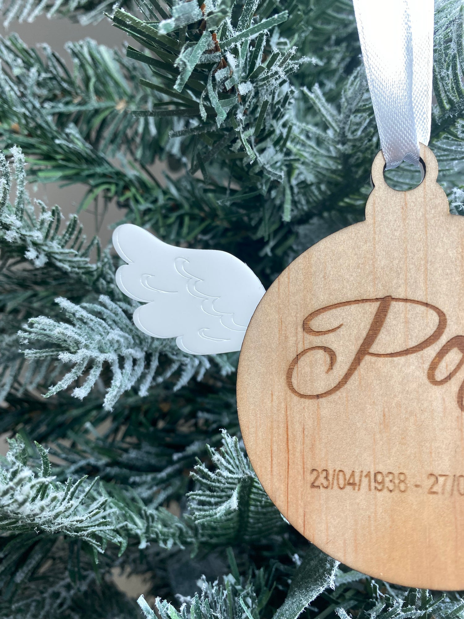 This angel wing bauble is 9cm tall, acrylic white detailed angel wings with custom engraved wooden front. Personalised with names and dates. Please add your requests to the special notes section when checking out. Message me if you have any questions.
