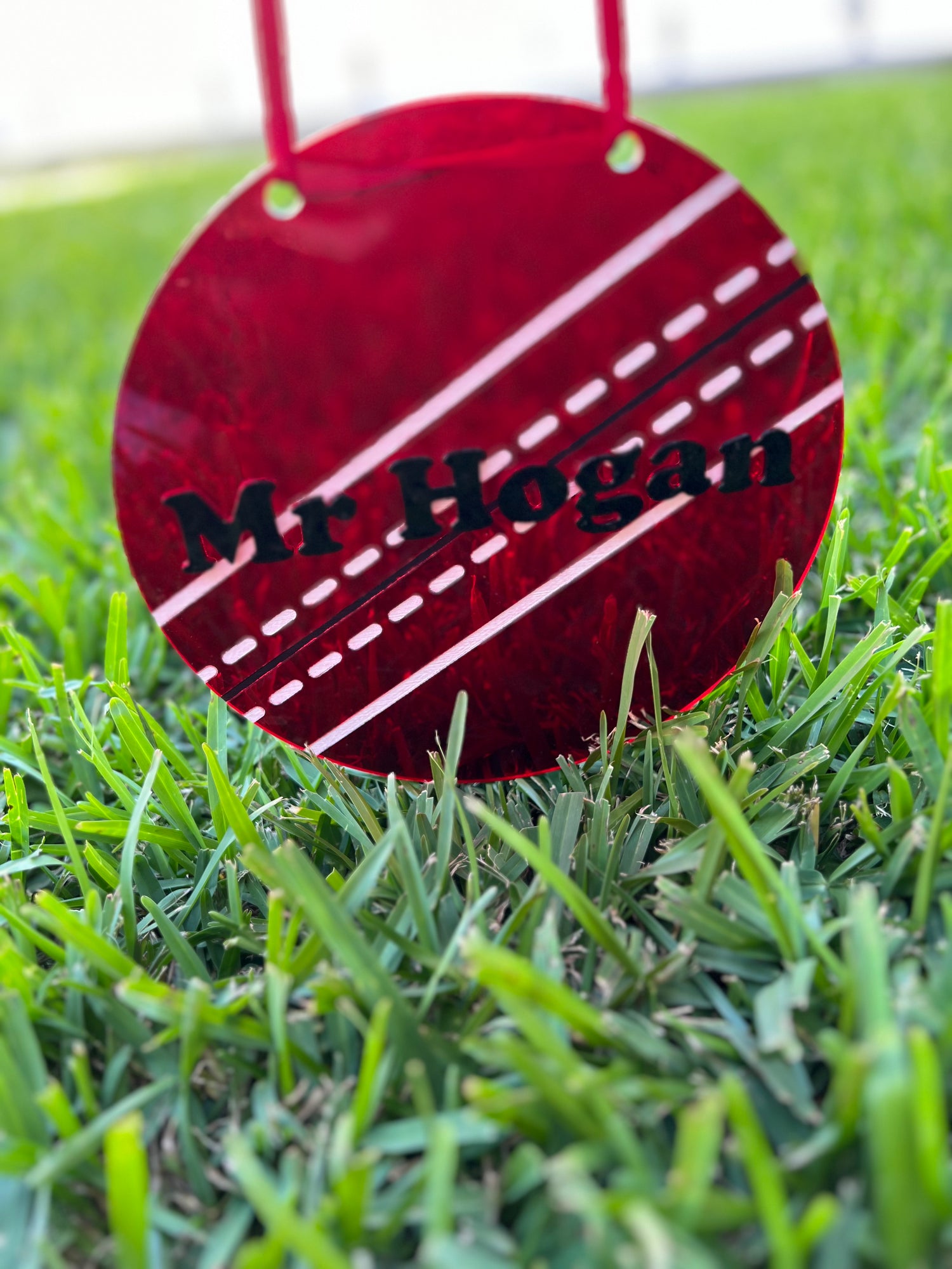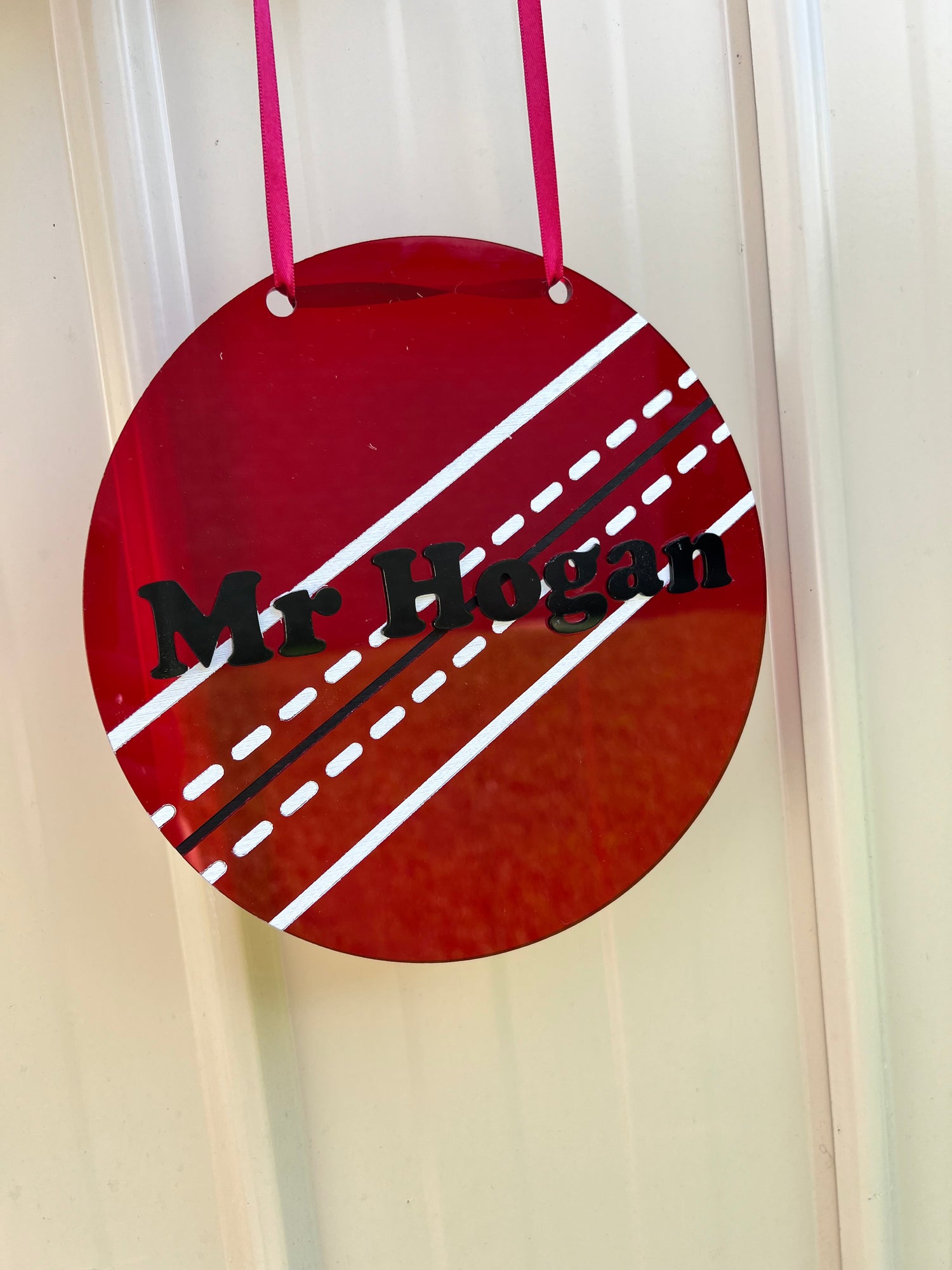 20cm. Personalised with your choice of name. Custom made to order. Ribbon colour may vary depending on availability. Layered acrylic and painted acrylic.